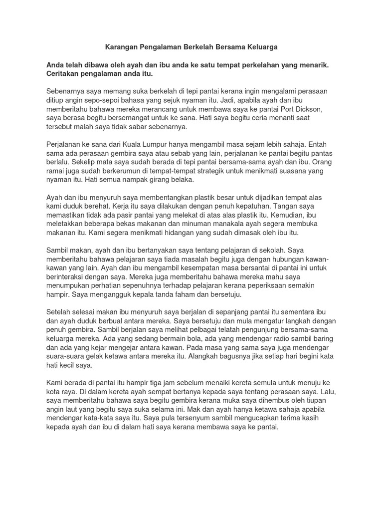 Telefon untuk dihubungi. Skop Kajian Jumlah responden bagi kajian ini terhad kepada mereka yang bercuti di kawasan pelancongan pantai Port Dickson di Negeri Sembilan Darul Khusus. Pada pukul 500 petang kami sekeluarga pun pulang ke rumah.