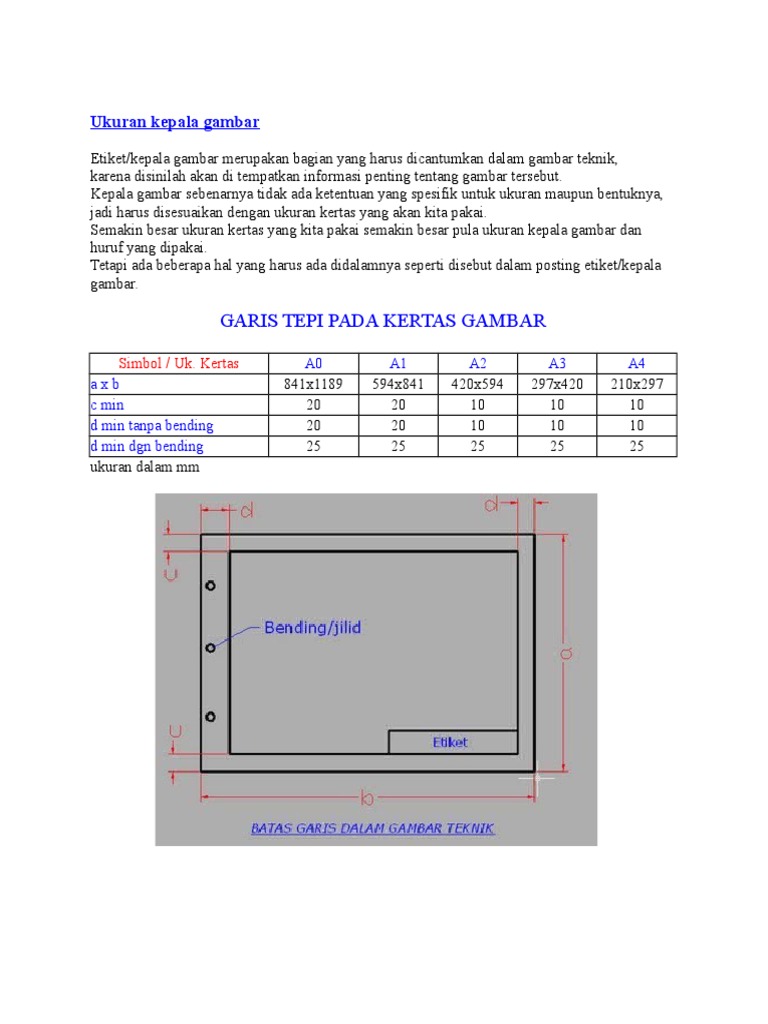 Penetapan jarak ini dimaksudkan untuk memberikan jarak sehingga jika kertas gambar. Standarisasi gambar tekn ik berfungsi sebagai berikut. Untuk ukuran kertas A4 posisi yang diperbolehkan hanyalah posisi tegakportrait sedang untuk ukuran A3 A2 A1 dan A0 diperbolehkan menggunakan kedua posisi kertas.